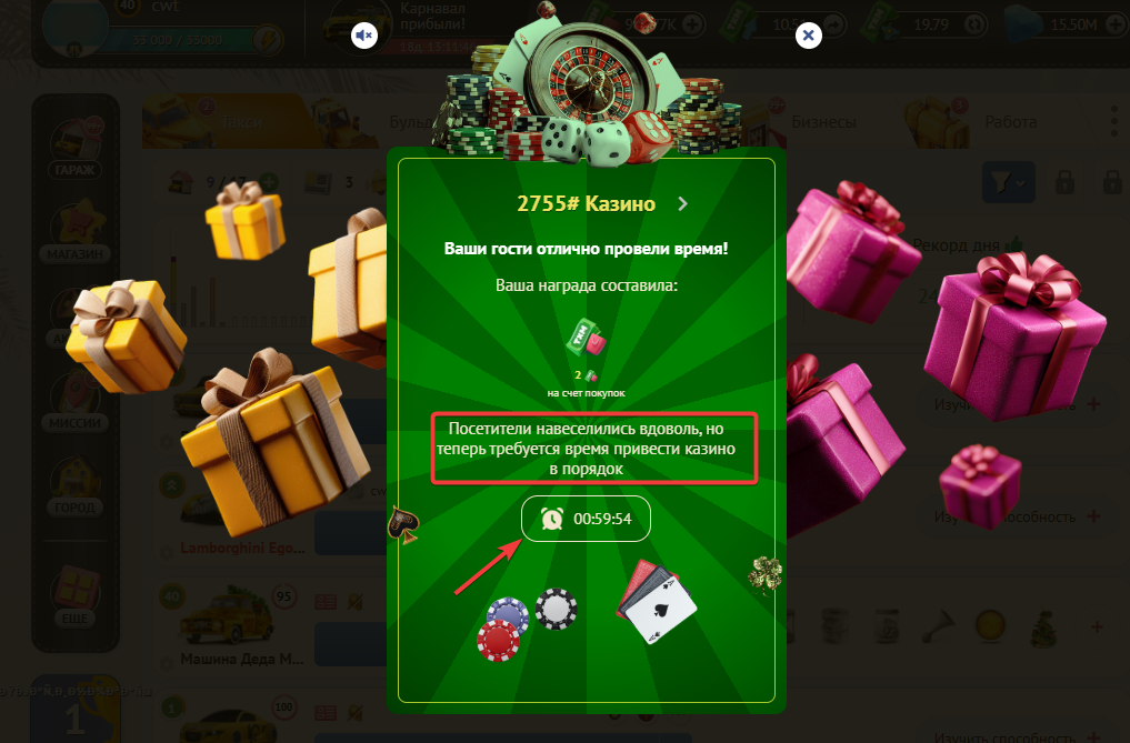 По истечению этого таймера, Вы снова сможете открыть свое Казино для генерации наград.