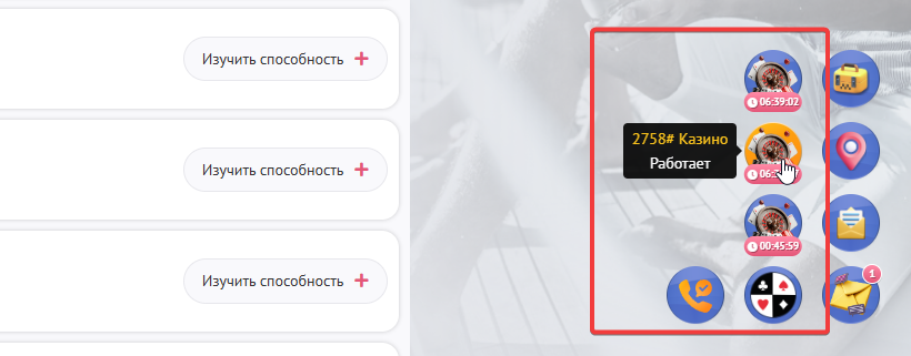 Построив несколько “Казино” Ваш виджет (иконка казино) будет разворачиваться, где будут видны все Ваши казино с таймерами и статусами на каком этапе сейчас находится казино